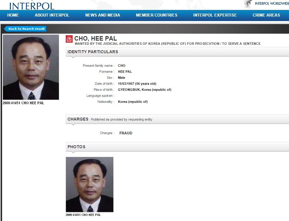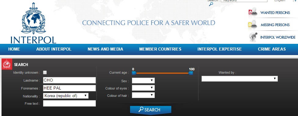이 CHO, HEE PAL로는 더이상인터폴에서 검색이 되지 않고 있다.