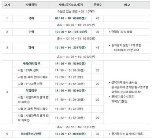 수능 시간표에 따르면 1교시 국어(08:40∼10:00)를 시작으로 2교시 수학(10:30∼12:10), 3교시 영어(13:10∼14:20), 4교시 사회·과학·직업탐구(14:50∼15:52), 5교시 제2외국어/한문(16:20∼17:00) 순으로 실시되며 오후 5시 종료된다.