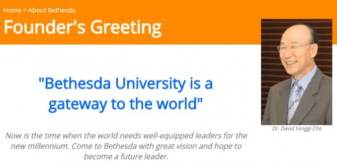 지금도 베데스다대 홈 페이지에는 설립자 조용기 목사의 사진과 인사말이 올라있다.