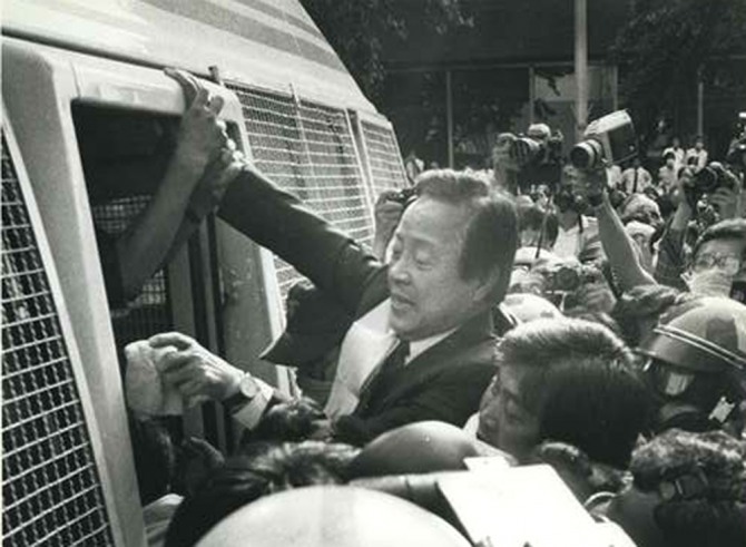 ▲산행 도중에 많은 낙오자도 있었다. 민주화도 이와 같다. 민주화의 길은 그만큼 고행의 길이다. 그러나 지금 우리는 민주화 산행에 있어서 최종 고지의 200m 전방에 와 있는 셈이다. (1987년 중앙일보 인터뷰에서)