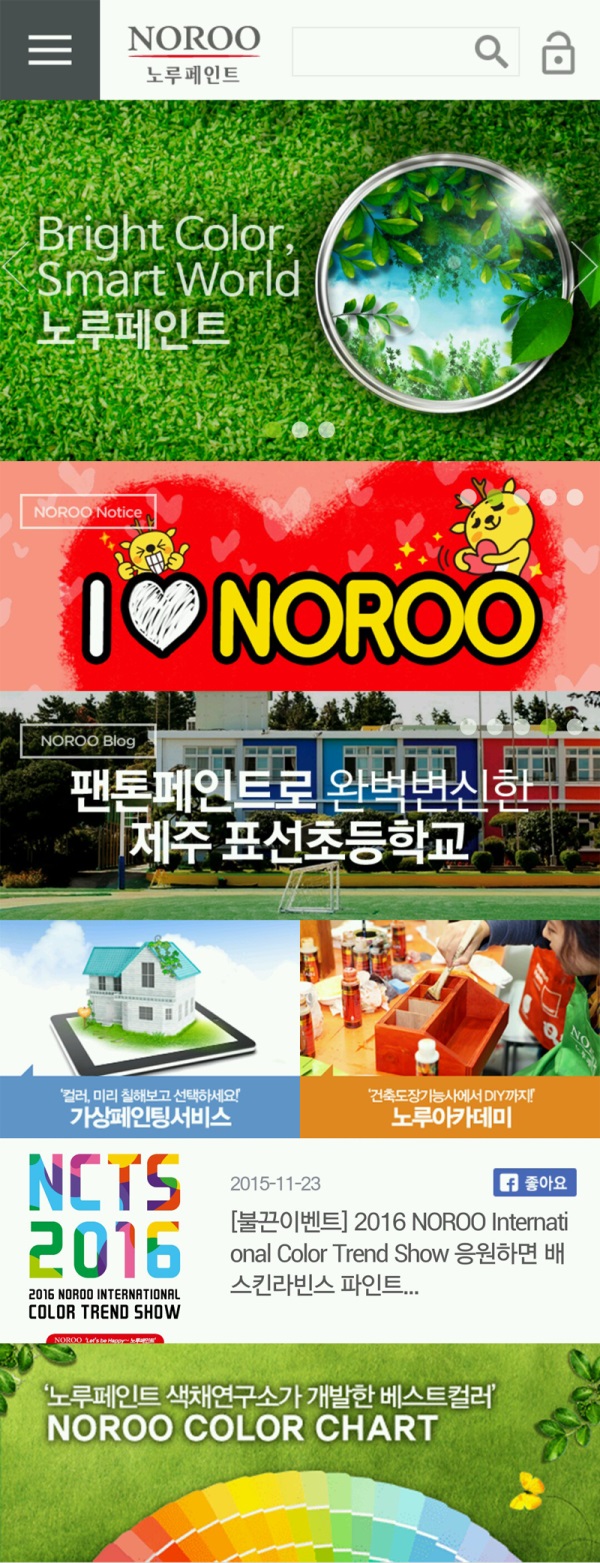 노루페인트 모바일웹사이트는 인터넷 홈페이지의 각종 정보와 서비스를 스마트폰에서도 편리하게 이용할 수 있도록 사용자의 편의성을 높이는 데 중점을 두어 개발되었다. 특히 사진촬영이 가능한 모바일의 장점을 적극 활용할 수 있는 가상페인팅서비스와 셀프페인팅 교육이 진행되는 노루아카데미의 신청이 편리해 졌으며, 페이스북, 블로그의 연동으로 DIY, 셀프인테리어 등의 다양한 콘텐츠를 제공하고 있다.