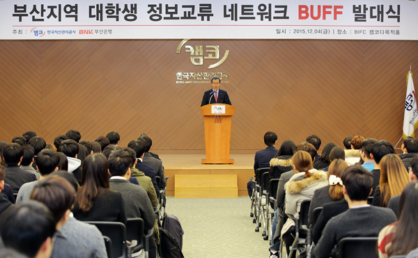 [글로벌이코노믹 김대성 기자] 홍영만 캠코(한국자산관리공사) 사장이 4일 오후 부산국제금융센터 3층에서 열린 '대학생 정보교류 네트워크 BUFF' 발대식에서 환영사를 하고 있다.