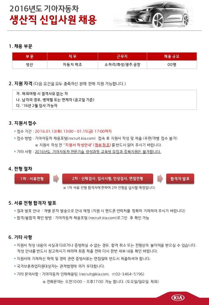 이번 기아자동차 채용을 통해 근무하게 되는 곳은 소하리, 화성, 광주공장 등이다
