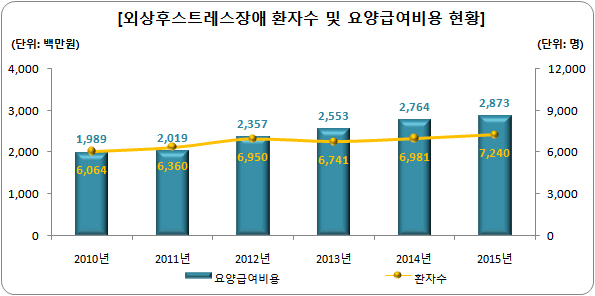 이미지 확대보기보건의료 분석평가 전문사이트인 팜스코어는 건강보험심사평가원의 보건의료빅데이터 통계자료를 토대로 최근 6년간(2010~2015년) 외상 후 스트레스 장애 환자수 현황을 분석한 결과 이같이 나타났다고 16일 밝혔다.