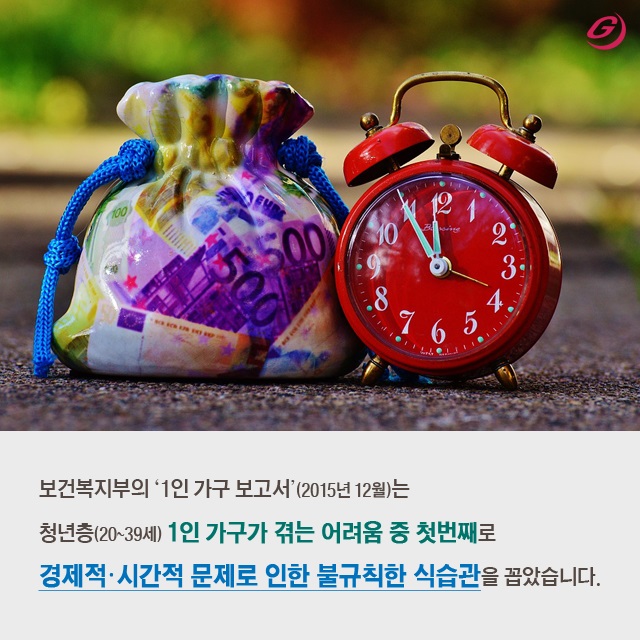 보건복지부의 ‘1인 가구 보고서’(2015년 12월)는 청년층(20~39세) 1인 가구가 겪는 어려움 중 ‘경제적‧시간적 문제로 인한 불규칙한 식습관’을 첫째로 꼽았습니다.
