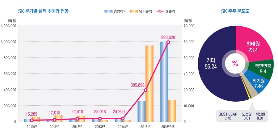 SK는 지난해 SK C&C와의 합병으로 인해 매출액과 순익이 급증하는 모습을 보이고 있다.