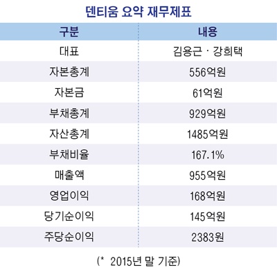 덴티움의 2015년 말 재무상태를 보면 자본총계 556억원, 부채총계 929억원, 자산총계 1485억원으로 되어 있다. 부채비율은 167.1%이다. 또 유동자산으로 갖고 있는 현금 및 현금성자산이 53억원에 달한다.