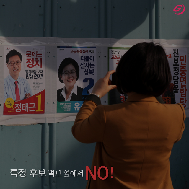 먼저 특정 후보의 선거사무소 또는 선거벽보 등을 배경으로 후보자의 성명‧사진‧기호가 나타난 인증샷을 SNS나 인터넷에 게시하면 안 됩니다.