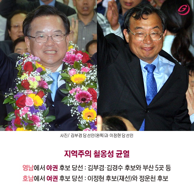 이번 선거에서 대구 수성갑 김부겸 후보와 경남 김해을 김경수 후보, 그리고 부산 지역구 5곳 등에서 야권 후보가 당선됐습니다. 호남에서는 새누리당 이정현(순천, 재선) 후보와 정운천(전주을) 후보가 당선됐습니다. 이를 두고 철옹성 같았던 지역주의에 균열이 생기기 시작했다는 분석이 나오고 있습니다.
