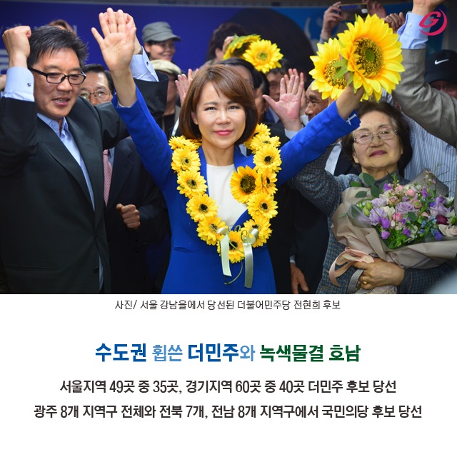 더불어민주당은 서울지역 지역구 49곳 중 35곳, 경기지역 60곳 중 40곳에서 선전해 수도권을 휩쓸었습니다. 반면 호남은 광주 8개 전체와 전북 7개, 전남 8개 지역구에서 국민의당 후보가 당선되면서 ‘녹색물결’을 이뤘습니다.
