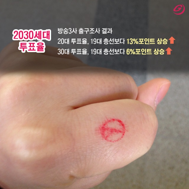 이번 선거에서 2030세대의 투표율이 지난 19대 총선과 비교해 크게 상승한 것으로 나타났습니다. 방송3사의 출구조사 결과를 통해 살펴보면 20대의 투표율은 19대 총선보다 13%포인트, 30대의 투표율은 6%포인트 증가했습니다.