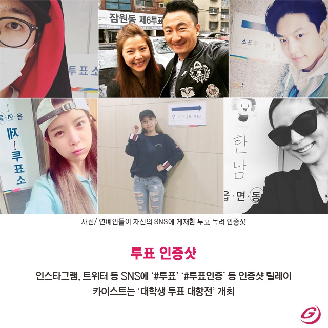 선거 당일인 13일 SNS에서는 투표 인증샷 릴레이가 이어졌습니다. 김나영과 김영철, 주영훈‧이윤미 부부 등 각자 자신의 SNS에 인증샷을 게재하며 투표를 독려했습니다. 카이스트에서 개최한 ‘대학생 투표 대항전’에서는 대학생들이 투표 인증샷을 공유하기도 했습니다.