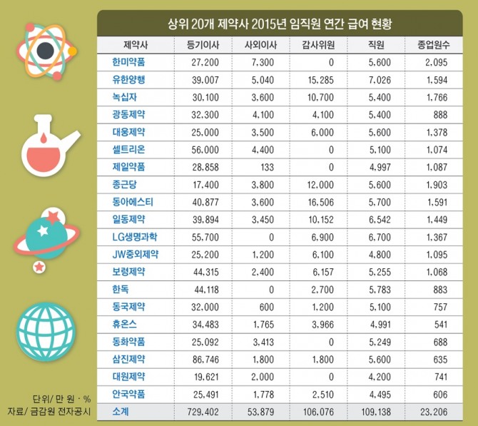 글로벌이코노믹이 19일 상위 20개 제약사 사업보고서를 분석한 자료에 따르면 이들 회사의 임원 평균 연봉이 3억6470만원에 달한 것으로 집계됐다.