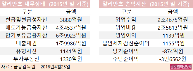2015년말 기준 알리안츠생명의 LAT(부채적정성평가) 결손금 규모는 약 1조5000억원에 달하는 것으로 알려졌다.