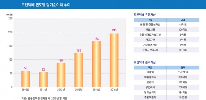 지난 2014년 로젠택배 실적은 매출액 2636억원, 영업이익 207억원, 당기순이익 164억원을 기록했고 영업이익률은 7.9%에 달했다.