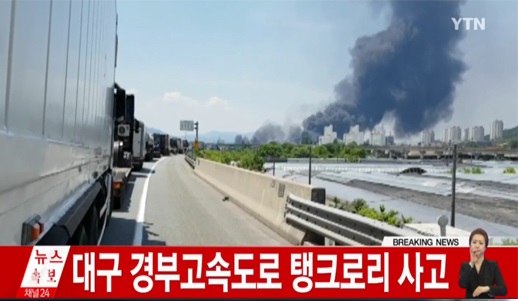 이미지 확대보기사진/ytn 캡처 20일 오전 11시 38분께 대구 동구 경부고속도로 상행선 대림육교 부근을 지나던 35t 탱크로리에 하재가 발생했다. 경부고속도로 사고 구간 일대가 큰 혼잡을 빚으면서 양방향 교통이 통제되고 있다.