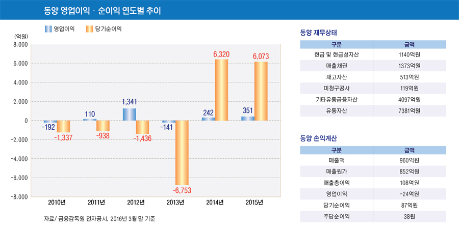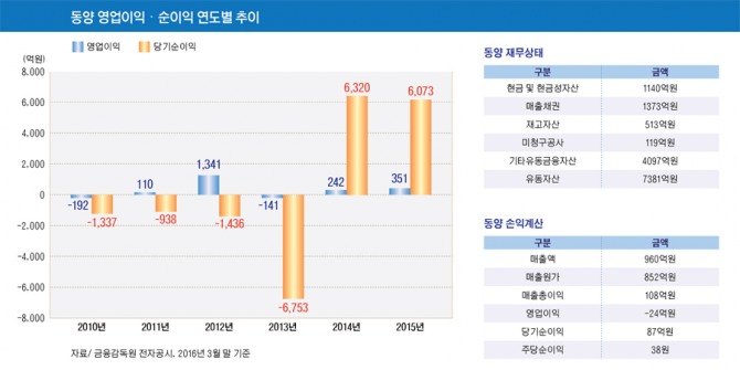 동양은 지난해 4개 분기 영업이익 흑자를 보였지만 올해 2월 법정관리에서 벗어나자마자 적자를 기록했다.