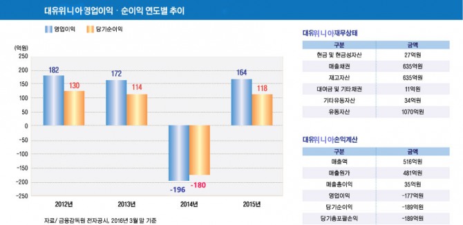 대유위니아는 올해 3월 말 현재 매출액 516억원, 영업이익 -177억원, 당기순이익 -189억원을 기록했다.