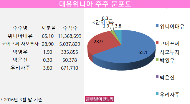 대유위니아의 최대주주인 위니아대유는 2014년 9월 1억원의 자본금으로 설립됐고 유상증자를 통해 올해 3월 말 현재 자본금이 460억원으로 늘어났다. 위니아대유는 지배회사인 대유에이텍이 90%를 보유하고 있고 대유신소재가 10%를 갖고 있다.