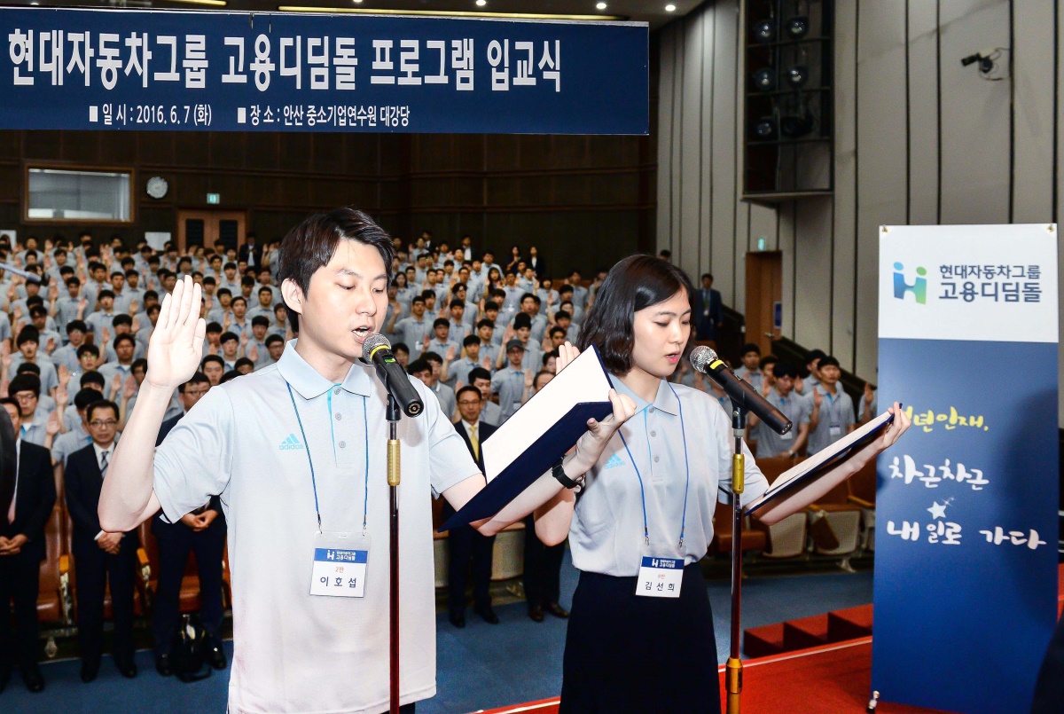 현대차그룹은 지난 7일 중소기업연수원 대강당에서 한성권 현대차그룹 인재개발원장, 권기섭 고용노동부 직업능력정책국장, 박인철 현대기아차 협력회 부회장 등 관계자와 프로그램 참가자 400명이 참석한 가운데 고용디딤돌 2기 입교식을 진행했다.