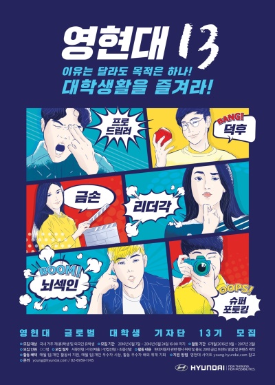 모집 분야는 크리에이터(기획·취재, 영상 및 사진 촬영 등 포함)와 리포터로 2개 부문이며 국내 거주 중인 내국인 재(휴)학생 및 외국인 유학생이면 누구나 지원할 수 있다. 지원은 현대자동차 대표 대학생 사이트 영현대를 통해 가능하다.