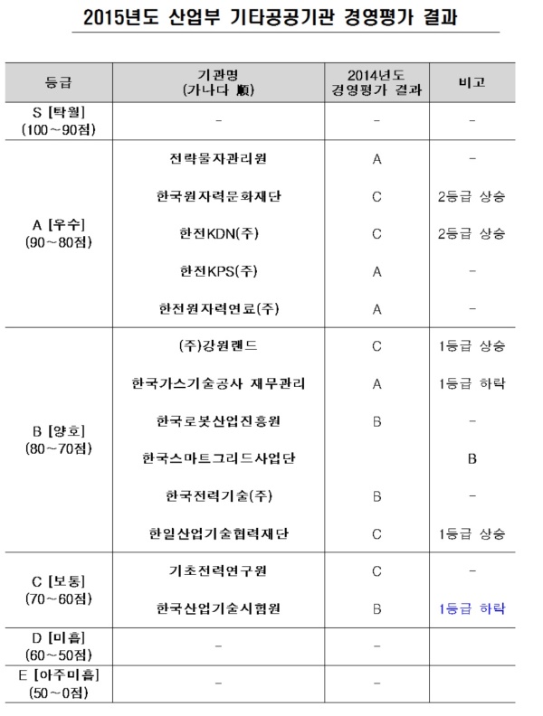 지난해 C등급이었던 한전KDN(주)와 한국원자력문화재단의 경우 경영부문 개선과 혁신과 주요 사업관리 등을 통해 지난해 대비 2개 등급이 상승했다. 1등급 하락한 곳은 한국가스기술공사와 한국산업기술시험원으로 올해에는 B와 C등급에 각각 랭킹됐다. 가스기술공사의 경우 재무관리 부분에서 낮은 점수를 받았으며 산업기술시험원의 경우 지방이전 대응책 미비로 매출이 하락하면서 등급이 내려갔다. 이밖에 강원랜드나 한일산업기술협력재단이 각각 1등급이 상승됐다.