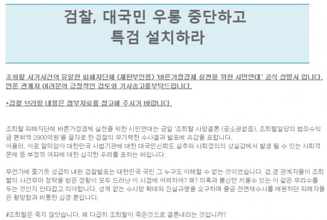 성명서 본문은 “조희팔 사건의 진실규명과 사건해결을 촉구합니다” 로 시작한다.
