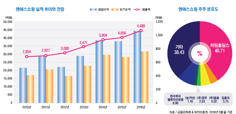 엔에스쇼핑은 올 3월 말 현재 하림홀딩스가 최대주주로 지분 40.71%인 137만1710주를 갖고 있으며 김홍국 하림그룹 회장이 3.75%인 12만6276주를 보유하고 있다.