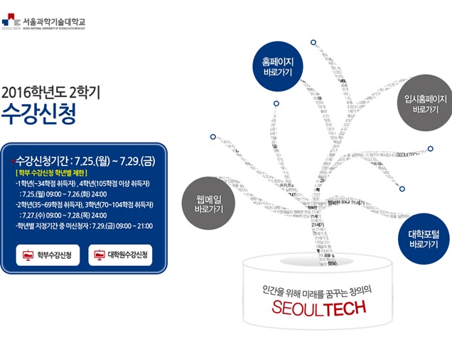 25일 오전 9시부터 26일 자정까지 서울과학기술대 수강신청 홈페이지를 통해 2016학년도 2학기 1, 4학년 수강신청이 진행된다.