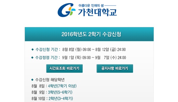 [글로벌이코노믹 최주영 기자] 가천대학교에 관심이 쏠리고 있다. 가천대학교는 8일부터 2016년도 2학기 수강신청을 실시하고 있다.