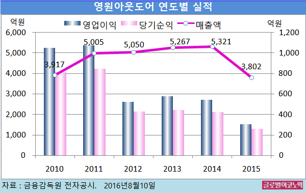 영원아웃도어는 지난 2010년부터 2011년 노스페이스 열풍으로 800억원이 넘는 순익을 남겼다. 2012년부터 2014년까지 400억원이 넘는 순익을 보이다 지난해 순익이 다소 줄어들었다.
