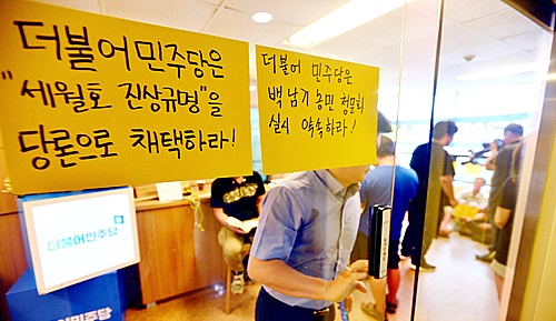 이미지 확대보기세월호 유족들로 구성된 4·16 가족협의회 장훈 진상규명분과장 등 6명은 25일 오전 서울 여의도 더민주 당사로 진입해 “세월호 진상규명을 당론으로 채택하고 조사위 활동 기간을 연장하도록 특별법을 개정하라”고 요구했다.