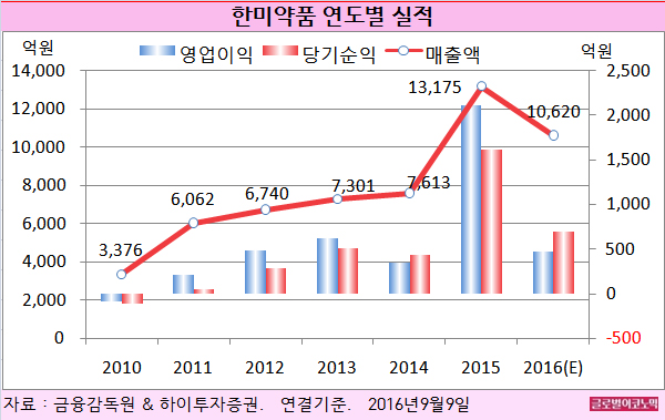 김 연구원은 한미약품의 올해 연결기준 매출액이 1조620억원(전년비 -19.4%), 영업이익 470억원(전년비 -77.8%), 당기순이익 700억원(전년비 -56.8%)를 기록할 것으로 내다보고 있다.