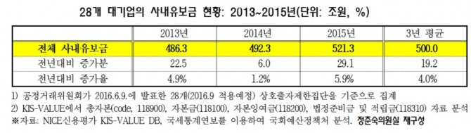 9일 국회 정춘숙 의원에 따르면 2015년 국내 28개 대기업의 사내유보금은 총 521조3000억원인 것으로 집계됐다.