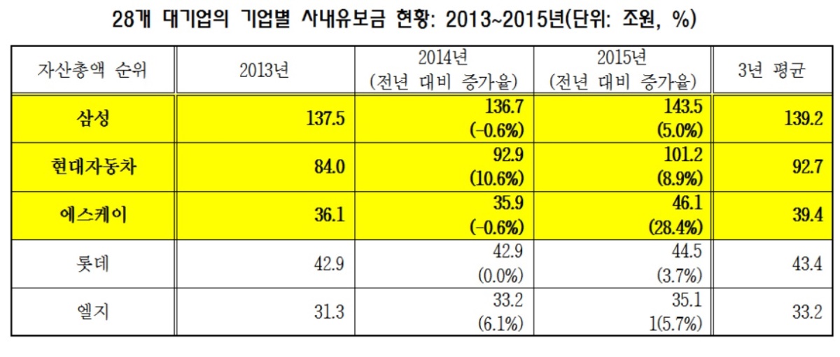 이어 롯데가 44조5000억원으로 많았으며 엘지가 35조1000억원으로 뒤를 이었다. 이들 다섯개 대기업의 사내 유보금을 합치면 370조4000억원으로 28개 대기업 유보금의 총액인 521조3000억원의 71%에 달하는 상태다.