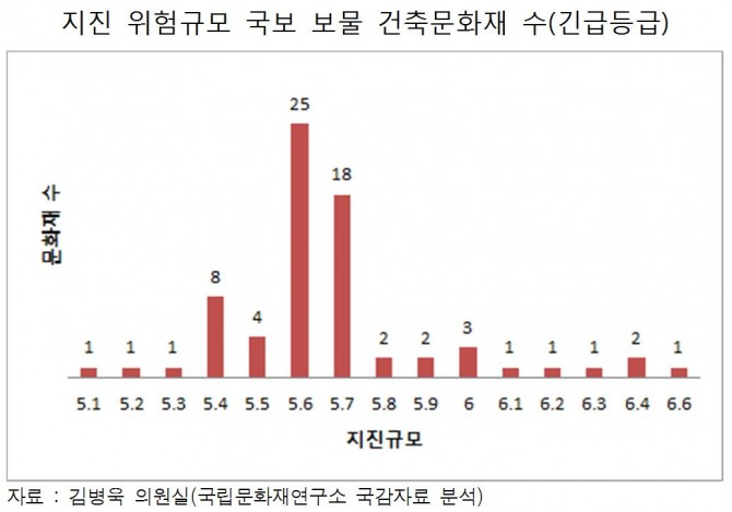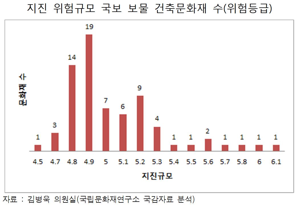 국회 교육문화체육관광위원회 소속 더불어민주당 김병욱 의원(성남시 분당을)이 국립문화재연구소로부터 제출받은 '건축문화재 지진·홍수 재해위험도 평가 및 관리시스템 구축' 연구용역 결과보고서(2013)를 분석한 결과 조사대상 국보와 보물 71건 중 60건(84.5%)의 지진긴급등급이 5.8이하로 나타났다고 29일 밝혔다.