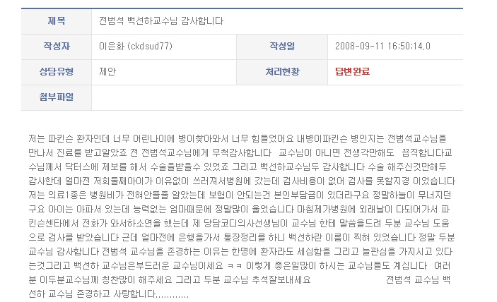 한편 서울대 병원 사이트에는 백선하 교수에게 보내는 감사의 글이 여러 건 올라있다.