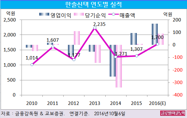 이 연구원은 한솔신텍의 올해 연결기준 매출액이 1700억원(전년비 +30.1%), 영업이익 170억원(전년비 +77.1%), 당기순이익 90억원(전년비 900.0%)에 이를 것으로 내다보고 있다.