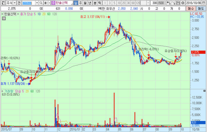 한솔신텍은 지난 6월 유상증자 발표 후 주주가치 희석 등으로 주가는 고점 대비 30% 이상 하락해 있는 상태다.