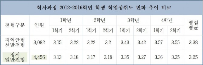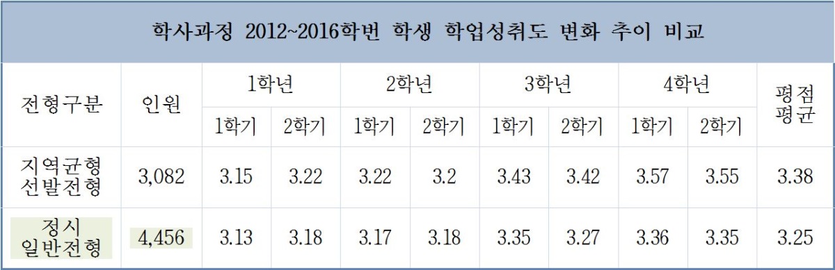 2012~2016학번들의 1학년 1학기 학점은 지역균형선발전형 학생들이 3.15점, 정시 일반전형 학생들이 3.13점으로 0.02점 차이가 났다. 그러나 4학년 2학기 학점은 지역균형선발전형 학생들이 3.55점, 정시 일반전형 학생들이 3.35점로 0.2점 차이로 벌어져 지역균형선발전형을 통해 들어온 학생들이 학년이 높아질수록 학업성취도가 높았다.