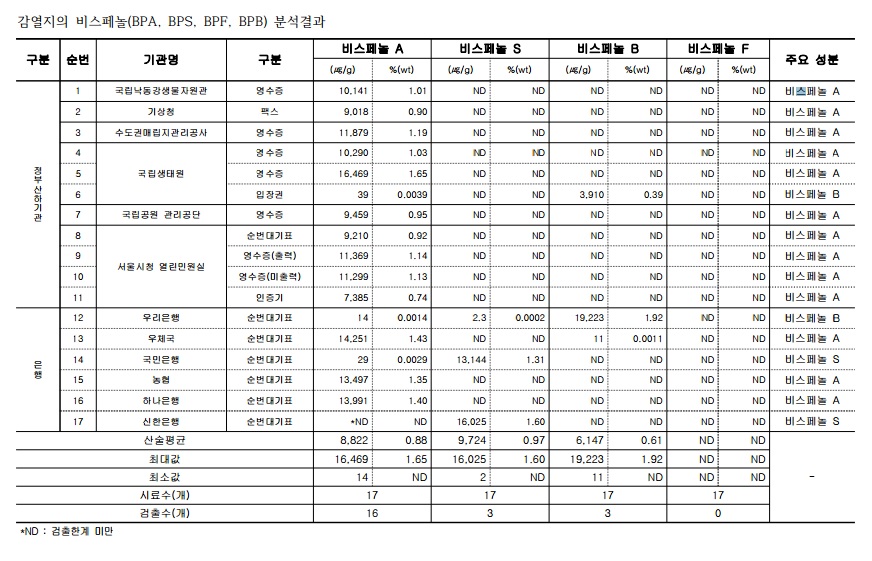 이번 조사에 따르면 정부산하기관에서 발급하는 영수증과 순번대기표에서 최대 1만6469㎍/g의 비스페놀계 내분비계장애물질이 검출되었다. 국립낙동강생물자원관 영수증에서 비스페놀A 1만141㎍/g, 수도권매립지관리공사 영수증 1만1879㎍/g, 국립생태원 영수증 1만190~1만6469㎍/g, 국립공원관리공단 영수증 9459㎍/g, 서울시청 열린민원실 영수증 11,369~11,299㎍/g 등 에서 비스페놀계 내분비계장애물질이 사용되고 있었다.