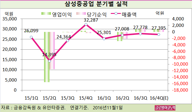 삼성중공업은 올 4분기에도 6000억원 정도 영업현금흐름 적자를 예상하고 있다. 그러나 3분기 말 현재 현금성자산이 1조4000억원 있고 유상증자 성공시 1조1000억원의 자금유입이 가능해 유동성 이슈는 없을 것으로 이 연구원은 전망하고 있다.