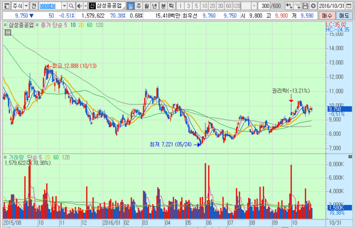 삼성중공업의 주가는 31일 종가 9750원으로 올해 5월 24일의 저가 7221원에 비해 35.0% 높은 수준에서 거래되고 있다.