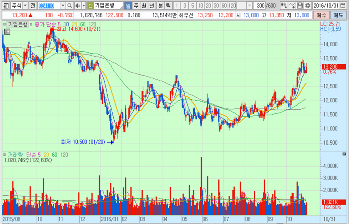기업은행의 주가는 31일 1만3200원으로 올해 1월 20일의 저점 1만500원에 비해 25.7% 상승한 수준에서 거래되고 있다.