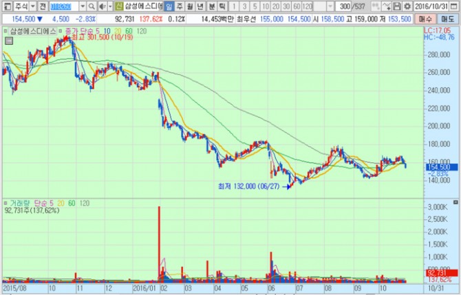삼성에스디에스의 주가는 31일 종가 15만4500원으로 지난해 10월 19일의 고점 30만1500원에 비해 48.8% 하락한 수준에서 거래되고 있다.