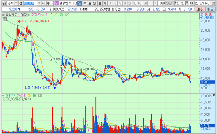 삼성엔지니어링의 주가는 1일 9200원으로 지난해 9월 17일 저점 2만2224원에 비해 58.6% 하락한 수준에서 거래되고 있다.