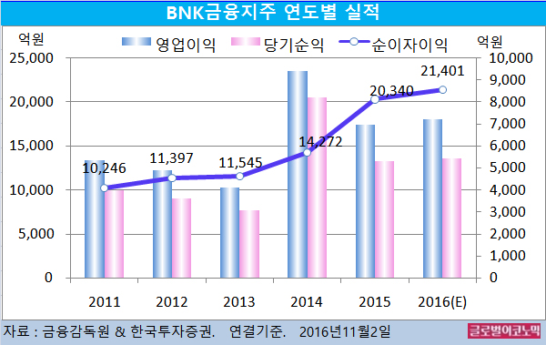 한 연구원은 BNK금융의 올해 연결기준 순이자이익이 2조1401억원(전년비 +5.2%), 영업이익 7230억원(전년비 +3.8%), 당기순이익 5440억원(전년비 +2.5%)을 기록할 것으로 예상하고 있다.