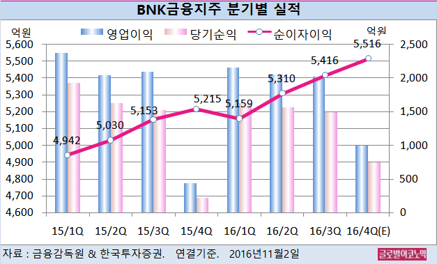 한 연구원은 BNK금융지주의 올 4분기 연결기준 순이자이익이 5516억원(전년동기비 +5.8%), 영업이익 998억원(전년동기비 +127.3%), 당기순이익 745억원(전년동기비 +238.6%)에 이를 것으로 내다보고 있다.