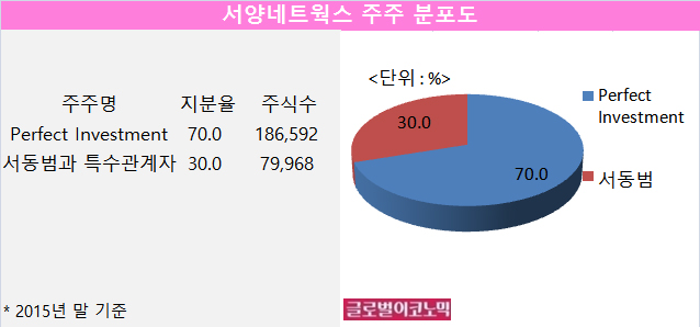 금융감독원 전자공시에 따르면 서양네트웍스의 2015년 말 현재 주주는 Perfect Investment(퍼펙트 인베스트먼트)가 지분 70.0%(18만6592주), 서동범 대표를 포함한 특수관계자가 지분 30%(7만9968주)를 보유하고 있다.