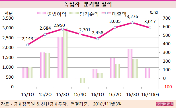 신한금융투자 배기달 연구원은 녹십자의 3분기 실적이 시장 예상치인 매출액 3309억원, 영업이익 403억원을 하회하며 예상대로 부진했다고 평했다.